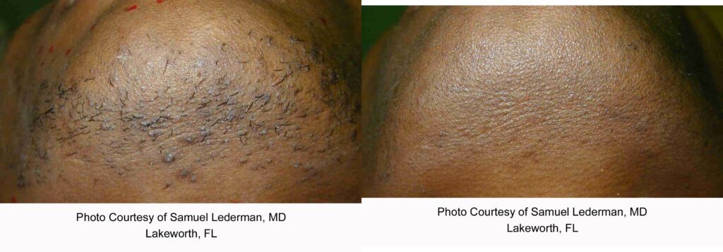 Immediately following a laser hair removal treatment, the treated area may appear a bit red and swollen. 3 to 7 days after treatment some people experience what appears to be regrowth of hair. What is actually happening is that most of these hairs are shedding as a result of your treatment, and are not regrowing. Between your laser hair removal treatments, you should not pluck or wax your hair.